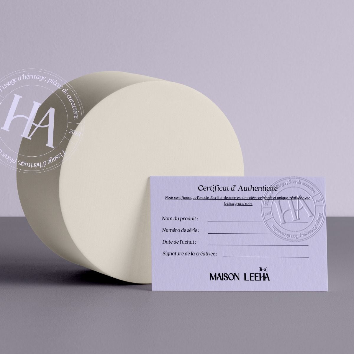 Pour souligner la singularité de chaque création, Maison Leeha accompagne chacune de ses pièces d’un certificat d’authenticité. Ce document atteste de l’unicité et de la qualité exceptionnelle de la pièce, inscrivant son acquisition dans une démarche durable et précieuse.